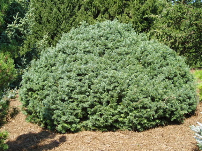 Je zimzeleni iglavec z kroglasto rastjo v mladosti, kasneje pa postaja vse bolj stožčasta oz. ovalna. V polni starosti doseže do 3,5 m višine in 3 m širine. Iglice so temno zelene.