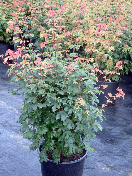 Je manjše listopadno drevo. Višina je odvisna od višine cepljenega mesta, od 3 do 5 m. Mladi poganjki so rdečkasto bronasti. Listi so široko dlanasti, pet kraki, temno zeleni, jeseni rumeni.