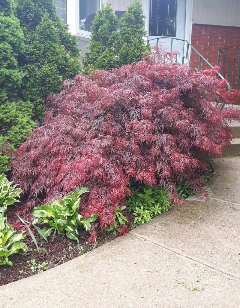 Srednje velik listopadni grm kompaktne, kupoli podobne rasti,z rahlo povešenimi poganjki. Listi so globoko narezani, razdeljeni na 7 do 9 krp, svetlo rdeči spomladi, bronasti čez poletje in škrlatno rdeči jeseni. V višino in širino doseže do 2,5 m. Sadimo ga na sončna rastišča v normalna ,za vodo prepustna tla.
