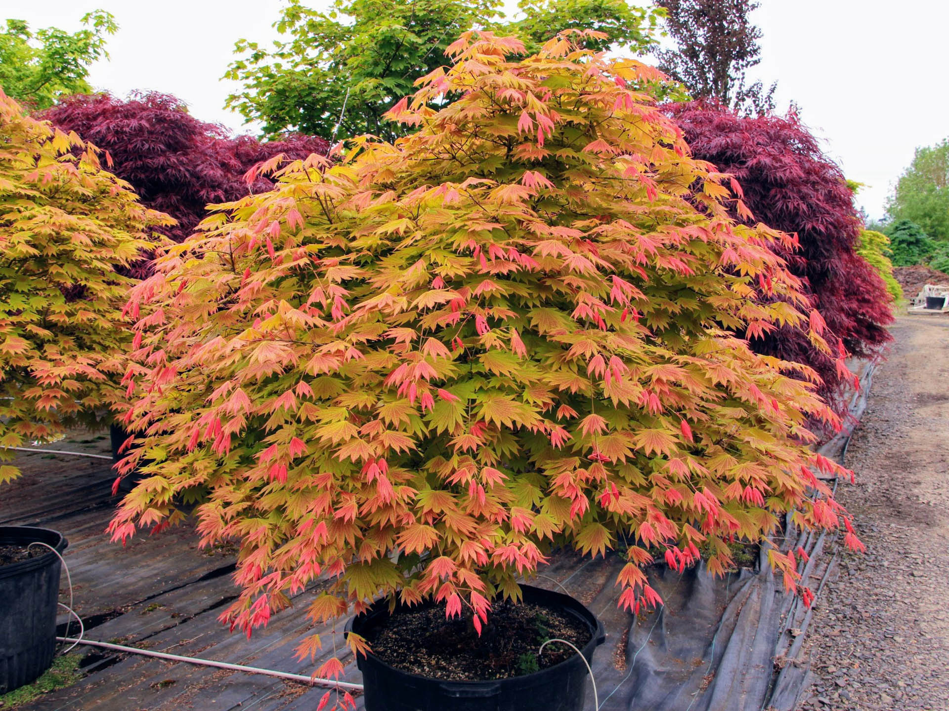 Acer shirasawanum ‘Moonrise’ je osupljiva izbira za vsak vrt. Ta čudoviti javor se ponaša z izjemno barvno paleto, saj njegovi listi skozi sezono prehajajo iz živahno rdeče in oranžne v žareče rumene odtenke. Kompaktna rast in elegantna oblika ga naredita idealnega za manjše vrtove in posode. ‘Moonrise’ je nezahteven za vzdrževanje in odporen na bolezni, kar zagotavlja enostavno rast. Ta javor je prava paša za oči in bo zagotovo postal središče pozornosti v vašem vrtu.