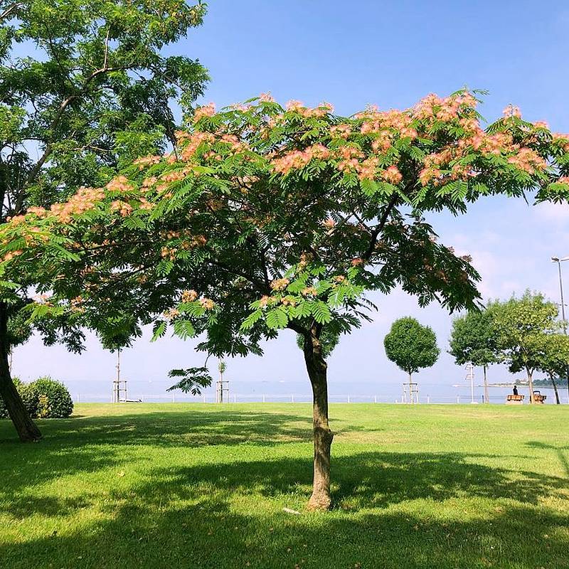 Albicija je srednje hitro rastoče, listopadno, srednje visoko drevo, ki v Sloveniji običajno zraste do 6 m v višino in nekoliko manj v širino . Krona drevesa je dežnikasta. List je sestavljen iz drobnih ovalnih lističev, temno zelen. Cvet je puhast, roza, dišeč in privlačen za čebele.Cveti od junija do avgusta. Iz cvetov se razvijejo viseči stroki, polni semen, ki ostanejo na rastlini skozi zimo. Priporočamo sajenje v zavetne lege.