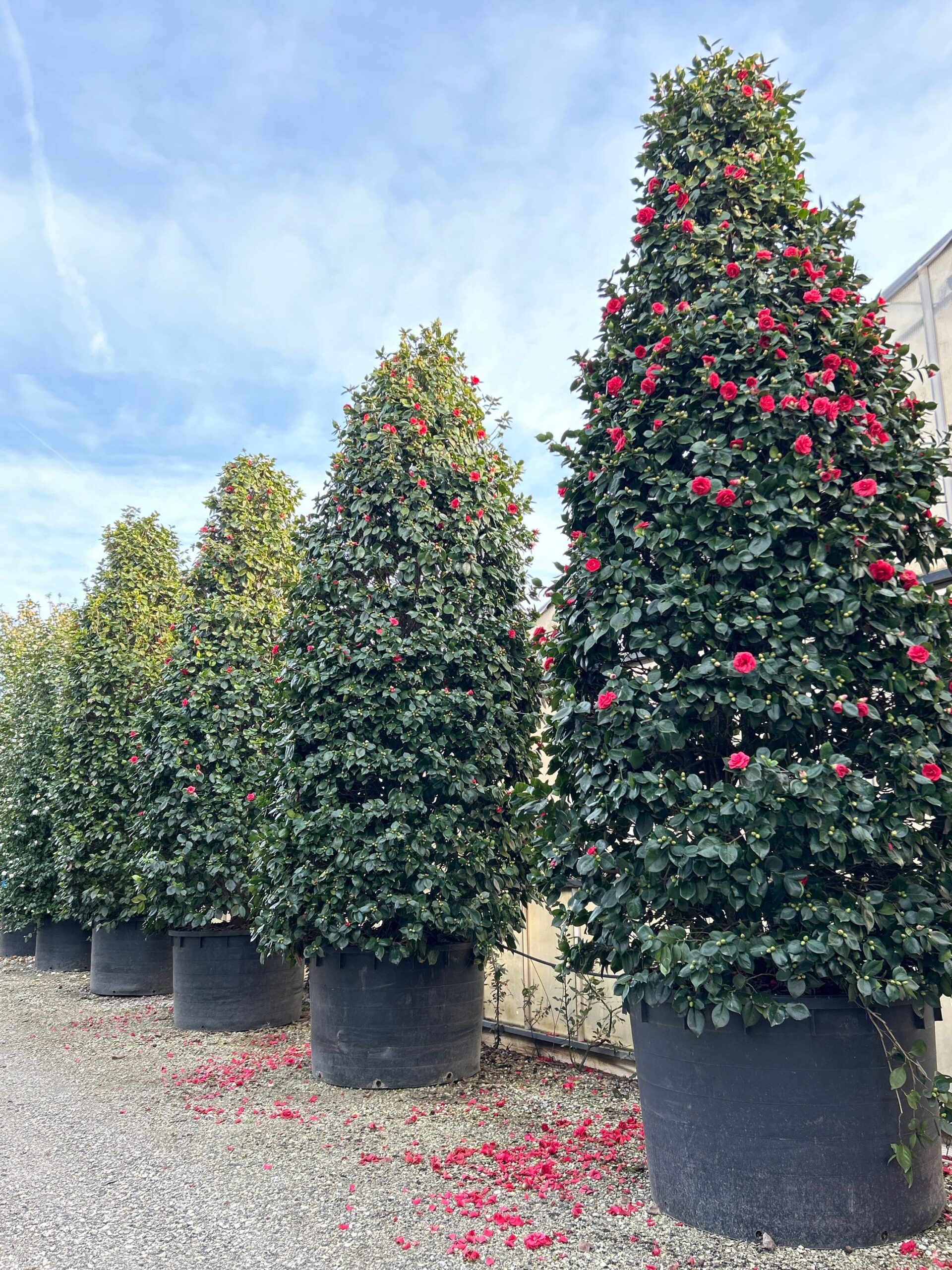 Camellia japonica ‘Gloire de Nantes’ v razredu EXTRA predstavlja vrhunec med klasičnimi rdečimi kamelijami. Gre za izjemno velik, dolgoletno vzgajan soliter, z izrazito pravilno, stožčasto obliko in izredno gosto krošnjo. Takšni primerki so redki in namenjeni projektom, kjer se išče takojšen prestižni učinek brez kompromisov.