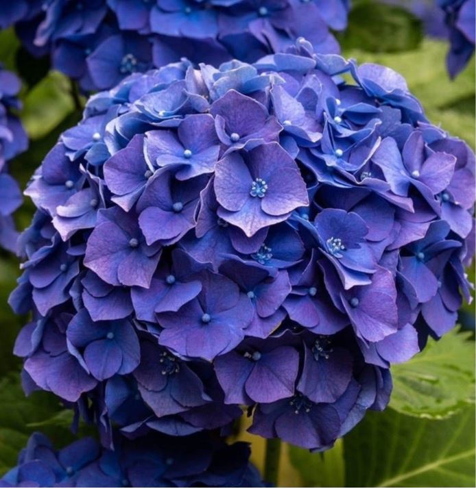 Vrtna hortenzija z veličastno, modro barvo cvetov, ki se najgloblje obarvajo v kislih tleh. Cvetovi so zelo široki, v središču cveta s temnejšimi drobnimi cvetovi in velikimi, sterilnimi cvetovi na zunanji strani oz. obodu cvetne glave. Listi so temno zeleni, široko ovalni, nazobčani. Številne cvetne glave, gručastih cvetov se odpirajo od poletja do jeseni. Hortenzije uspevajo na vlažnih, rodovitnih in odcednih tleh na delnem soncu ali senci.