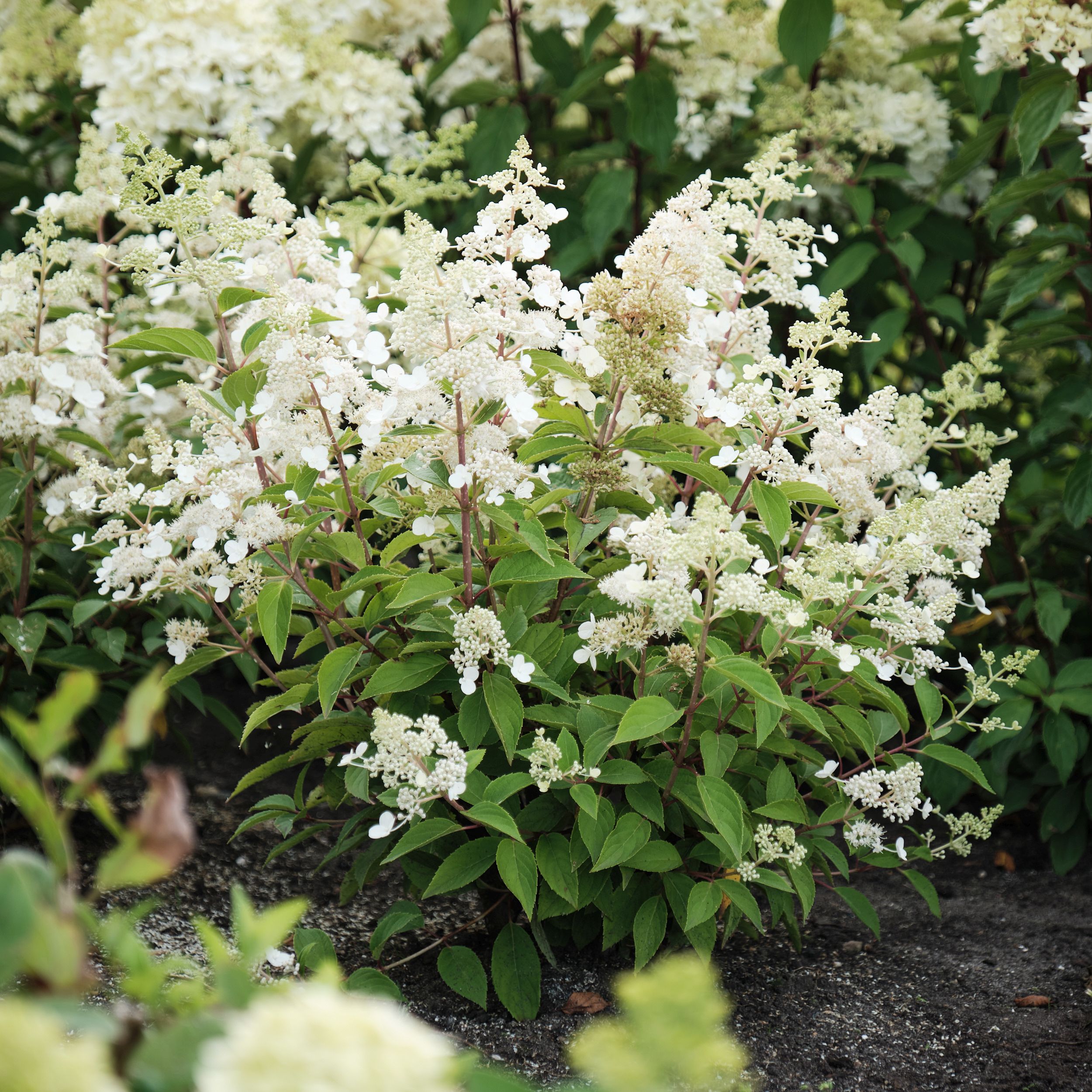 Hydrangea paniculata ‘Magical Himalaya’, znana kot “Magical Himalaya Hydrangea” v angleščini in “Zauberhortensie Magical Himalaya” v nemščini, je izjemna sorta hortenzije, ki očara z velikimi, belimi cvetovi, ki s časom prehajajo v rožnate odtenke. Ta grmovnica, visoka do 1,5 metra, je idealna za različne vrtne zasnove, od soliternih zasaditev do mešanih gredic. Uspeva v sončnih do polsenčnih legah in zahteva bogata, vlažna, dobro odcedna tla. Z dolgim obdobjem cvetenja od poletja do jeseni, odpornostjo na nizke temperature in enostavnim vzdrževanjem, ‘Magical Himalaya’ prinaša dolgotrajno lepoto in eleganco v vsak vrt.