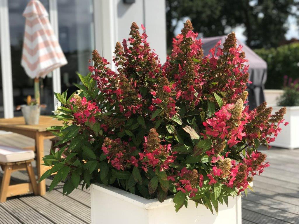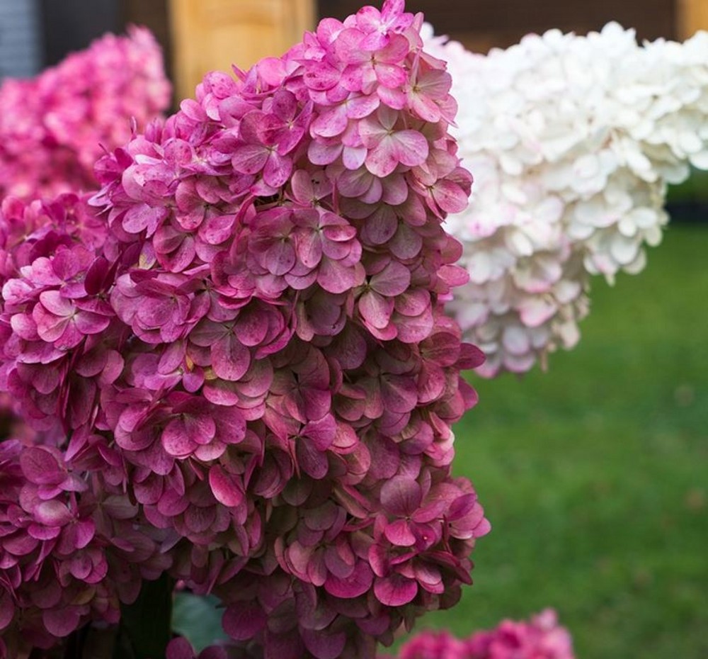 Hydrangea paniculata ‘Magical Vesuvio’, znana tudi kot Latasta hortenzija, je spektakularna sorta, ki prinaša eksplozijo barv, podobno dramatičnemu izbruhu vulkana Vesuv. Njene goste, piramidne cvetne glave se pojavijo sredi poletja in prehajajo od živo bele do bogatih rožnatih in rdečkastih odtenkov skozi sezono, kar daje dinamičen vizualni učinek. Ta srednje velika grmovnica, ki zraste do višine 1,5 metra, je idealna za različne vrtove, od samostojnih poudarkov do mešanih gredic. ‘Magical Vesuvio’ uspeva na sončnih do polsenčnih mestih in preferira vlažna, dobro odcedna tla, kar omogoča enostavno vključitev v številne krajinske zasnove. Z njeno odpornostjo na nizke temperature in enostavnim vzdrževanjem, Hydrangea paniculata ‘Magical Vesuvio’ obljublja dolgotrajno lepoto in je odlična izbira za vsakogar, ki si želi v svoj vrt vnesti pridih vulkanske strasti in topline.