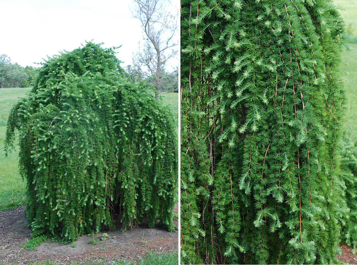 Povešavi macesen je znan po svojih mehkih iglicah in kaskadni obliki rasti s povešenimi vejami do tal. Spada med listopadne iglavce, kar pomeni da jeseni odvrže zlato rumene iglice. Tvori pokončno sedeče storžke, ki so sprva zeleni, nato rdeče vijolični, v zrelosti pa rjavi, polni luskastih semen. Iglice so mehke, kratke, svetlo zelene, v šopih po 35. Lubje je luskasto, sivo, v starosti rdečkasto rjavo. Višina rasti je odvisna od višine cepljenja. V širino doseže do 1,8 m.