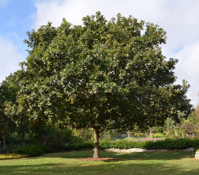 Je veliko listopadno drevo, ki lahko zraste od 18 do 25 m. Krona drevesa je široko zaokrožena. Je eden najpočasneje rastočih hrastov. V mladosti je letni prirast približno 30 cm, spet drugi viri navajajo, da je lahko letni prirast tudi do 90 cm. Kakorkoli, v dvajsetih letih lahko pričakujete približno 6 m visoko drevo. Lahko doseže zelo visoko starost, tudi do 400 let. Lubje je sivo, robustno. Listi so usnjati, temno zeleni, s 5 do 9 zaobljenimi krpami, ter spremenljivih oblik. Ugajajo mu dobro drenirana tla na soncu, vendar se prilagodi širokemu spektru tal. Prve želode tvori šele po 35 letih. Želodi so precej veliki, od koder izvira tudi latinsko ime.